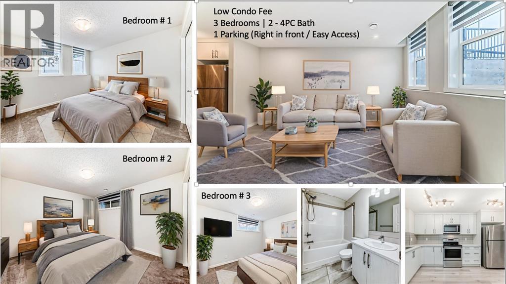 Low Condo Fee Townhome | 2023 BUILT | 3 Large Bedrooms | 2- Full Baths | Grand Living Space | High Ceilings | Open Floor Plan | L-shaped Kitchen | Quartz Countertops | Stainless Steel Appliances | Stacked Laundry | Large Windows | Large Concrete Patio w/ BBQ gas line | Assigned Parking Stall. Welcome to this one level townhome in heart of Cranston’s Riverstone community. It consists of 3 large size Bedrooms / 2x4PC Bath / High ceiling throughout the unit with over 1,057 SQFT of living space. This immaculately presented townhome is the perfect addition to any INVESTMENT PORTFOLIO or for a FIRST or SECOND TIME HOME BUYER. This affordable condo features: spacious kitchen with ton of cabinetry with Quartz countertop and tile backsplash, all STAINLESS-STEEL appliances. It also consists of large bright windows letting in a TON OF LIGHT in the unit, MASTER BEDROOM with ENSUITE & large closet, second and third spacious bedrooms, GREAT SIZE LIVING AND DINING ROOM. For FLOORING: Luxury vinyl plank flooring throughout the living room, dining room and kitchen, and carpets with thick underlay in the bedrooms for your comfort. ADDED BONUS, comes with 1 Assigned PARKING STALL right in front of the Unit. Pets allowed (Condo board restrictions apply), location is exceptionally close to schools, medical, dental, banks, strip mall, cineplex, restaurants, parks and playgrounds and all amenities. Exceptionally close to Deerfoot Hwy, Stoney Hwy, Parks, Golf Course, Bow River walking trails and transit access. Enjoy the perks of the Cranston Clubhouse just a 5 minutes drive from your doorstep. Come see it before it's gone! This condo will not last long, call to book your tour today! (id:53430)