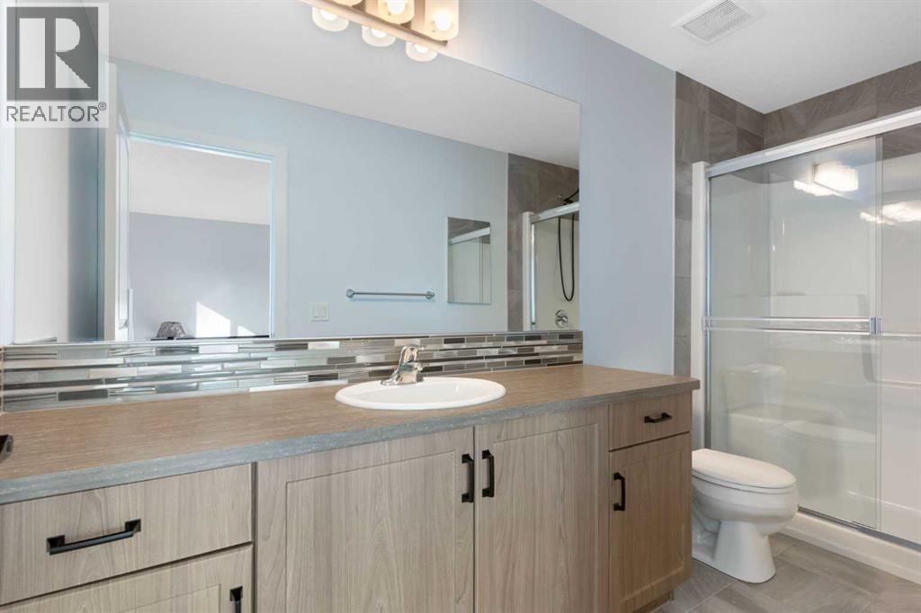 It's time to skip the new build headaches! New construction homes at this price have NO landscaping, NO basement development, NO A/C, NO window coverings and rarely a garage. That is tremendous value in a beautifully maintained home with so many upgrades! This 4 bedroom 3.5 bath home has over 2000 sq ft of developed living space that has been well cared for and recently updated with luxury porcelain tile on the main floor, new carpets upstairs with top of the line underlayment, and the entire home has been recently painted. The main level is open and bright with extra recessed lighting added, crown molding and a rear kitchen with quartz countertops with a breakfast bar, a corner pantry and a large under mount sink looking out to the spacious backyard. Upstairs features the primary bedroom with 3 piece ensuite and walk in closet, two additional well-sized bedrooms, a full 4-piece bathroom with dual sinks, and convenient upstairs laundry. Downstairs you’ll find a large recreation area, a beautiful 4-piece bathroom, and a spacious bedroom, making it perfect for extended family, visitors, or simply extra room to spread out. The home also has air conditioning to keep the whole family comfortable in the summer months.The east-facing backyard is a private retreat, thoughtfully set up for both relaxing and entertaining. Enjoy the 12’ x 22’ floating deck tucked behind a privacy wall and covered by a retractable pergola, complete with a gas line for your BBQ or a patio heater. The rest of the yard is fully fenced, landscaped with soft, low-maintenance grass, and a wide pathway leading to the oversized 20’ x 22’ detached garage . Most attached garages fall short in size with the width being 17-18'. The garage has been customized with impressive storage solutions including rafters, pegboard, shelving, overhead I-beams with extensive bin storage, and tire racks. Enjoy the sunset in the evenings on the 8'x9' deck at the front of the house, a short pathway connecting you to the boulevard, perfect for a relaxing spot in the evenings. A truly turn-key home that works for a wide range of lifestyles Daily conveniences of a daycare, mexican restaurant, a pharmacy, Tim Hortons and a gas station are just a 2 min walk, plus a future commercial area with a new grocery store coming within the community just a 4 min walk , future school site 5 min walk away, 2 playgrounds within a 6 min walk and access to the Bow River pathway system only a 15 min walk away round out the community. Highway 1A is a mere minute away giving you quick access to Cochrane or to head west to the mountains. With the new interchange completed commuting into downtown Calgary can take as little as 35 minutes, with access to Stoney Trail in only 20 minutes. (id:53430)